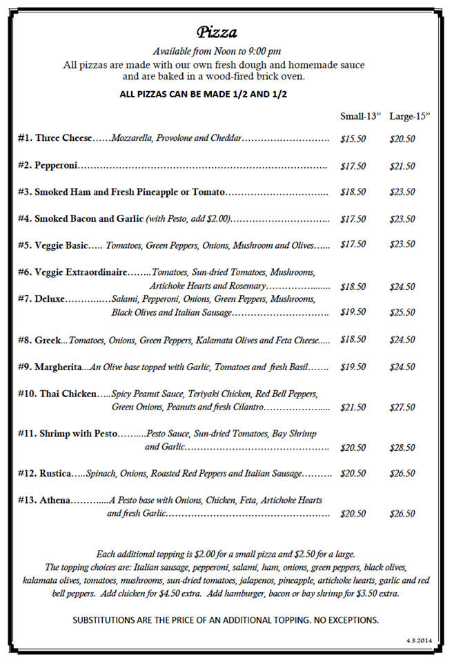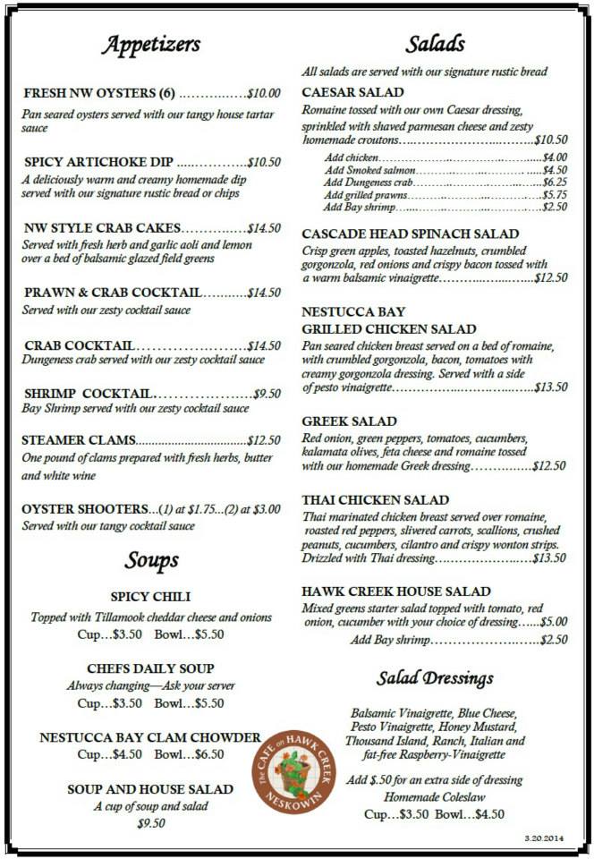The menu is varied with emphasis on local seafood. Five different entrée salads are popular, each served with the café’s signature rustic bread. A variety of pizzas all start with fresh dough and homemade sauce, and then are baked in a wood fired brick oven. The wine list is extensive, including a wide variety from Northwest vineyards. Oregon microbrews are among the 10 beers on tap.