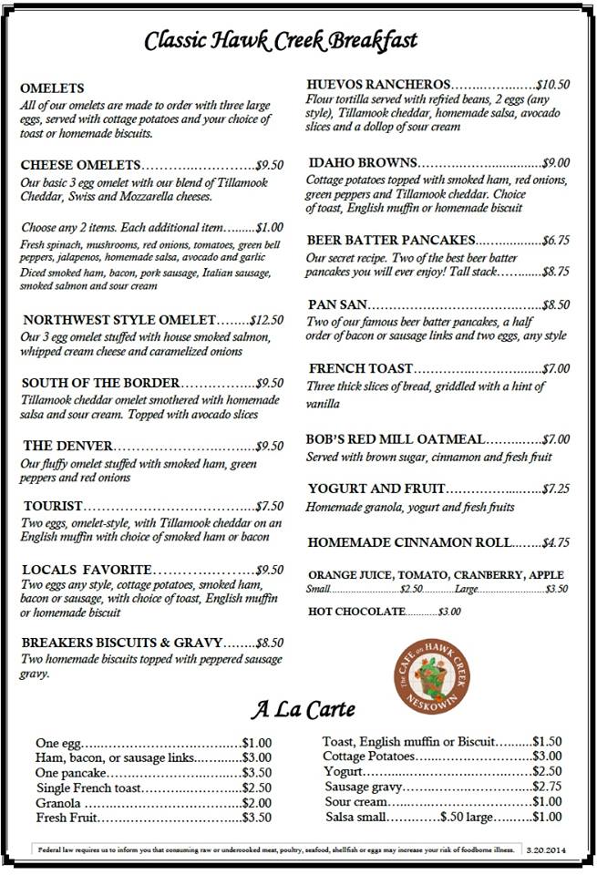 Over the ensuing years the café was operated by several owners, but in 2012 it closed. Recognizing how much it meant to the local community, Genie and Frank purchased the business. Using local tradespeople whenever possible, Frank and his son completely remodeled the building. The Café on Hawk Creek was reopened.